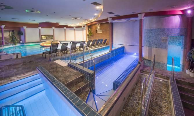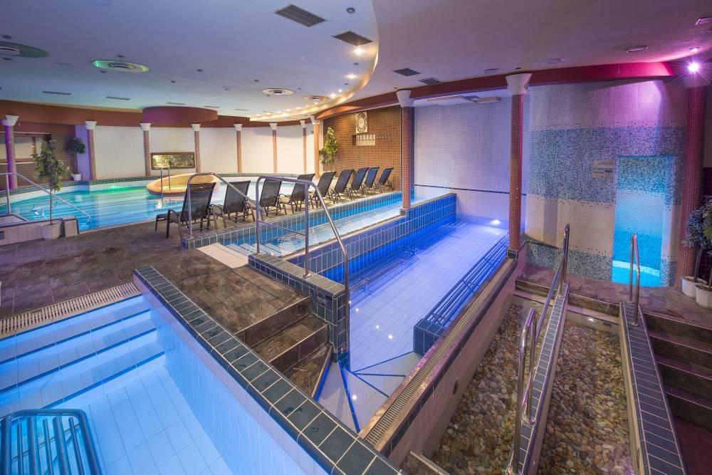 - neobmedzený vstup do bazénového sveta (veľký relaxačný bazén s vírivkou a protiprúdom, tri kľudové sedacie bazény, Kneippov bazén pre nohy, chrlič na chrbát)